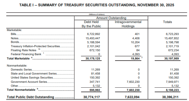 数据显示,美国财政部短期国库券(T-Bills)、中期国债(Notes)、长期国债(Bonds)、通胀保值国债(TIPS)和浮动利率国债(FRNs)的总额,在11月份进一步攀升了约0.7%,达到近30.2万亿美元。